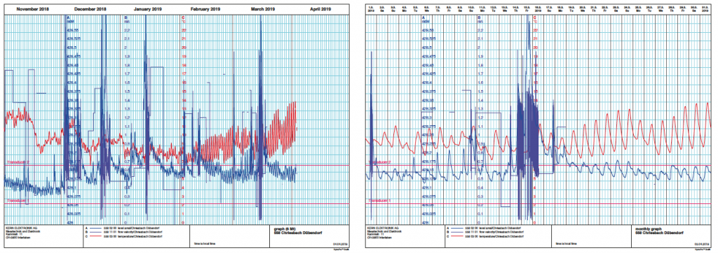 The correspondences between measurements and model parameters are chosen so that seasonal changes (in temperature), daily rhythms (in oxygen saturation from photosynthesis) and occasional events (turbidity caused by thunderstorms and construction work) leave their traces in the graphics, by transitioning from a few large boulders to a river-bed with many small pebbles, from one emergent biological pattern into another, or from a slowly meandering flow into a violent gusher.