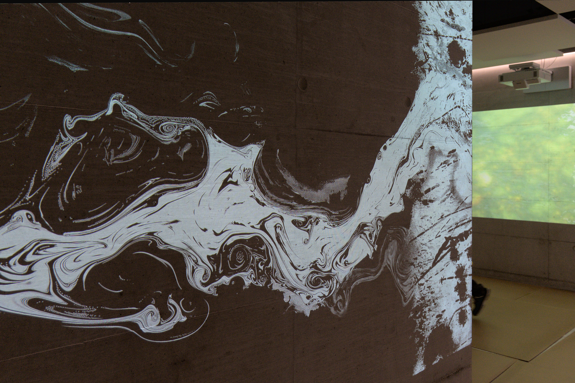 At the borders of each of the projections, there is a zone where collection of color-data and ab-initio generation of patterns intersect: Here, moderate motion in the camera sows nutrients into the simulation, while strong contrasts locally wipe out life, leaving scratches of current events being pulled into the organic eddies of the simulation.